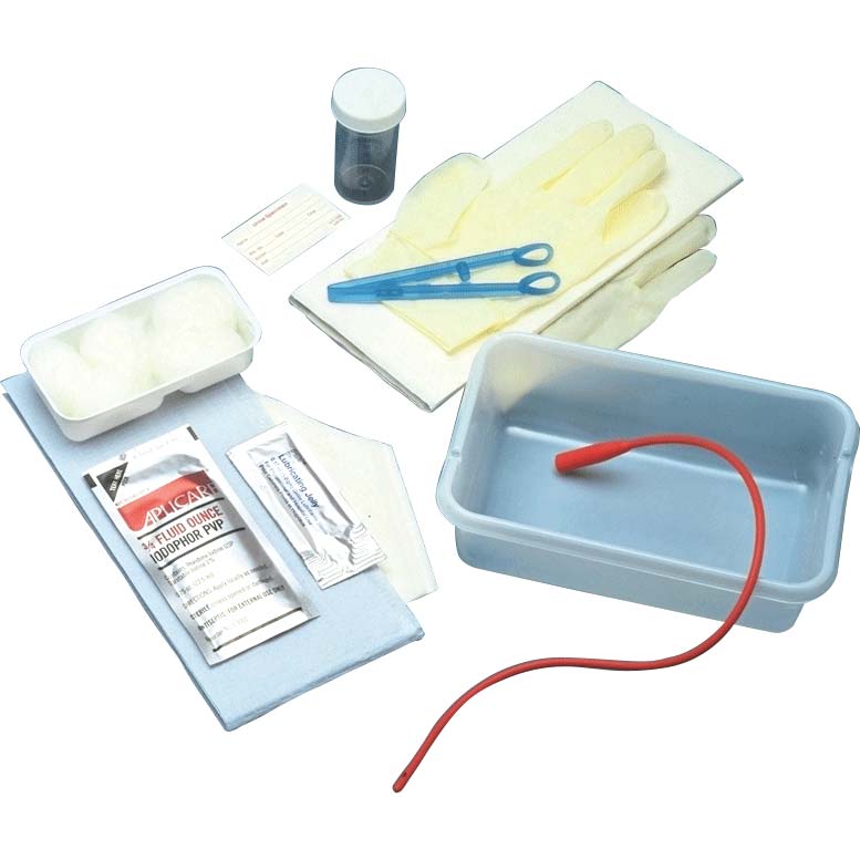 Dover Red Rubber Open Catheter Tray 14 fr Sterile, Pair of latex exam gloves