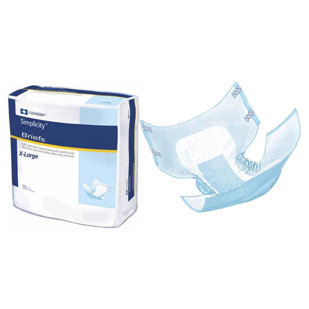 Simplicity Basic Quilted Adult Brief, X-Large 59" - 64", Beige. The Simplicity Basic Quilted Adult Brief offers a traditional-style cut with refastenable tabs and a trim mat designed to promote dignity. A dual action core is designed to quickly lock in fluid and neutralize unpleasant odors while helping to keep the skin dry and comfortable. The whisper quiet backsheet is ultrasonically bonded to offer a quieter, discreet and dignified solution. Breathable side panels allow air to skin contact to help minimize heat buildup.